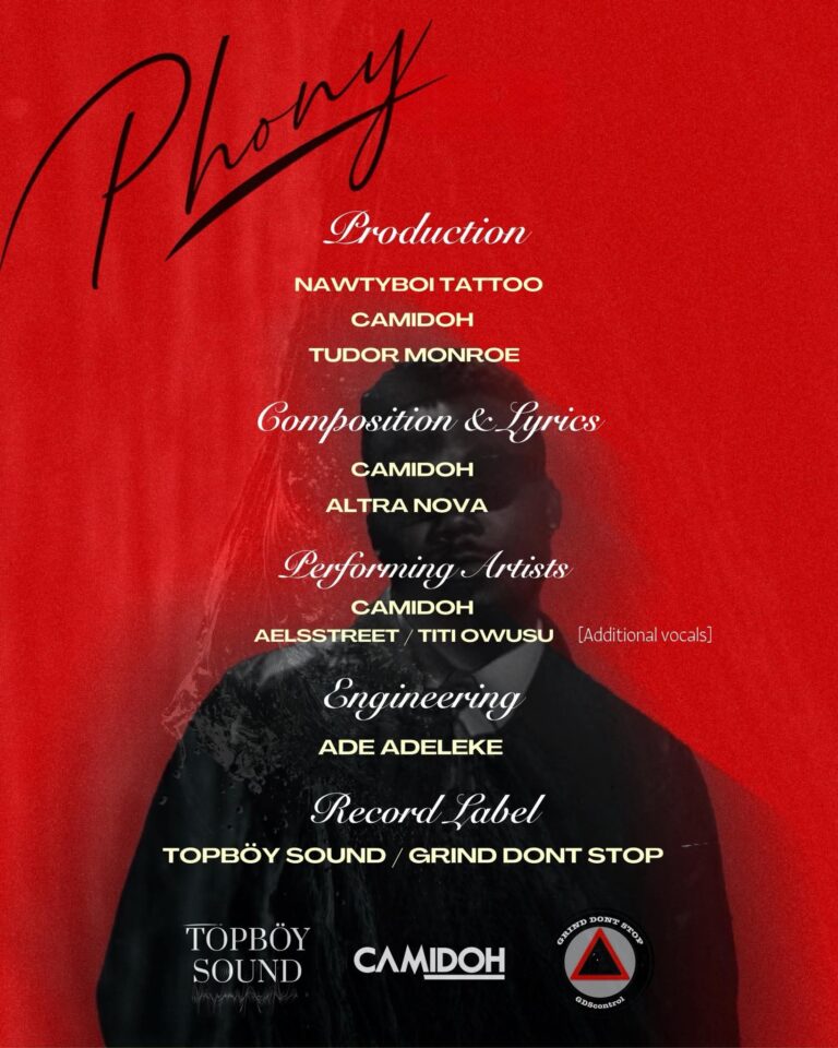 Produced by the gifted Nawtyboi Tattoo, “Phony” is a captivating mid-tempo Afrofusion gem that masterfully balances deep emotional resonance with irresistible dance-floor energy. From the very first note, the track pulls listeners into an intimate world of vulnerability and groove, proving once again that Camidoh possesses that rare ability to make you feel every word while still moving your body.